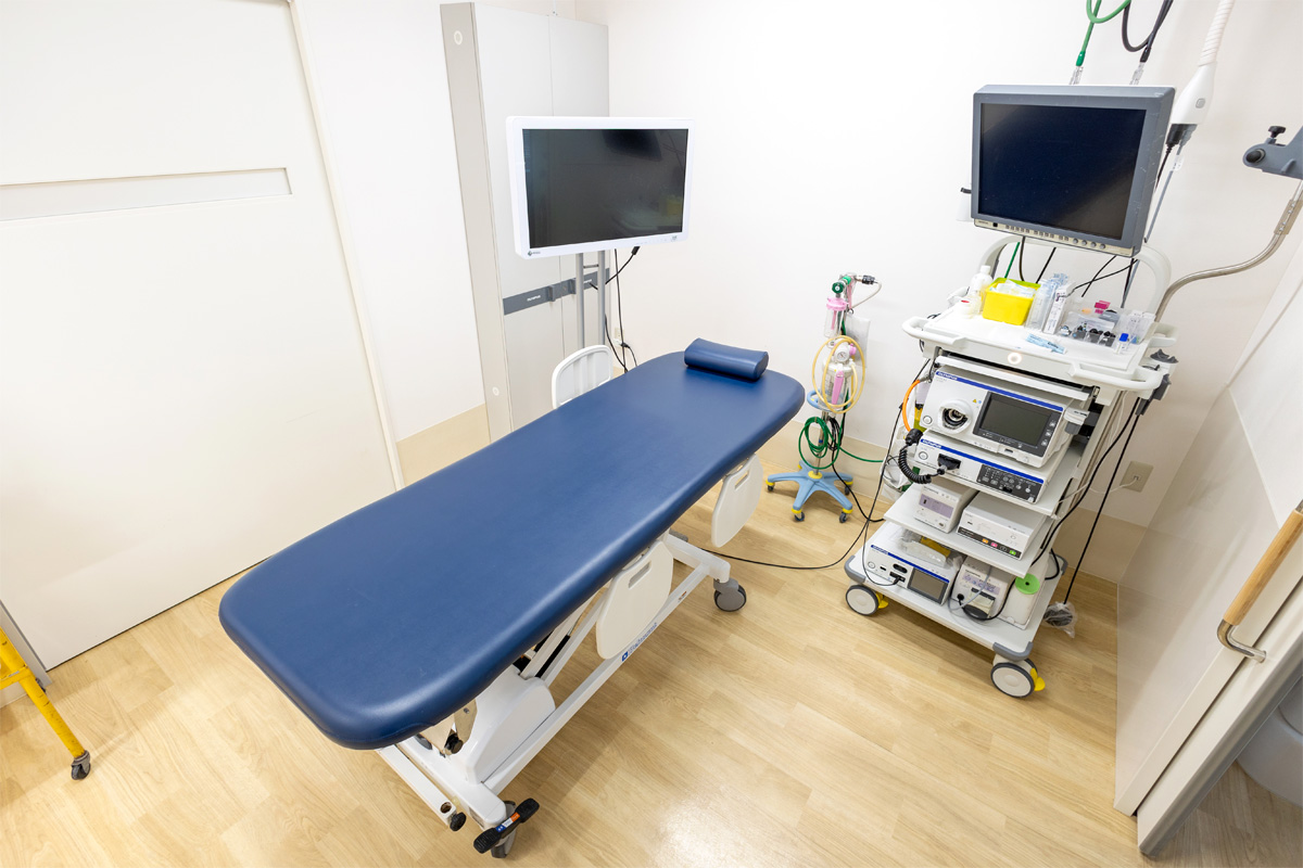 当院では、胃カメラ(上部内視鏡)や大腸カメラ(下部内視鏡)を行う専用の内視鏡室を完備しています。患者さまに検査や治療が安心・安全、そしてスムーズに実施できるように環境を整えています。大腸カメラに関しては、下剤を2時間ほどかけて飲んでいただかなくてはならないため、プライバシーに配慮した専用のトイレ付個室を用意しています。