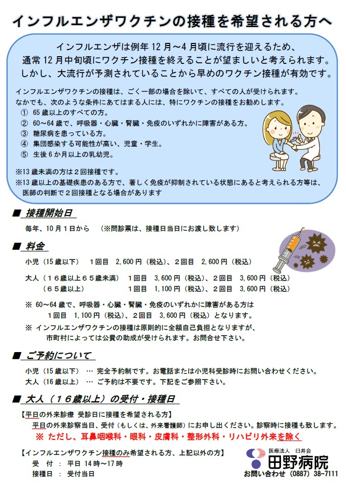 インフルエンザワクチンの接種を希望される方へ ホーム > お知らせ > インフルエンザワクチンの接種を希望される方へ 10月1日より、インフルエンザワクチンの接種が開始されています。 詳しくは、下記ポスターをご覧ください。