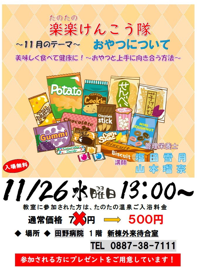 11月26日(水)楽楽けんこう隊を開催します ホーム > お知らせ > 11月26日(水)楽楽けんこう隊を開催します 下記の日程で楽楽けんこう隊を開催します。 日程:2025年11月26日(水)13:00~13:30 場所:田野病院 新棟1階 外来待合室 ※7月の楽楽けんこう隊より 開催日程:毎月 第4水曜日の午後1時~ 開催場所:田野病院 新棟1階 外来待合室 に変更になりました。お間違えのないようによろしくお願いします 詳細につきましては、下記ポスターをご覧ください。 皆さまのお越しをスタッフ一同お待ちしております。
